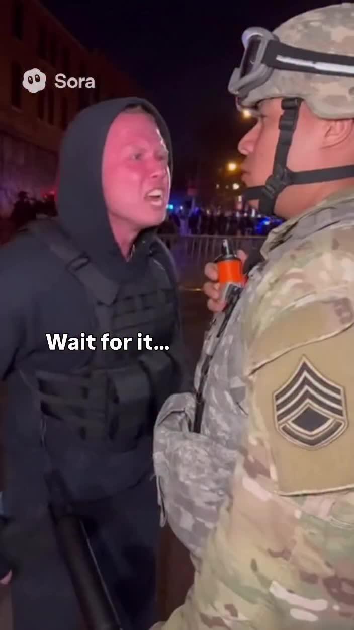 Does a video show a real confrontation between a shouting protester and a man in uniform who identifies himself as Sgt. Pepper? No, that's not true: This video has a watermark from Sora, an app from Open AI that generates videos from text prompts. The TikTok account from which this video originated has posted several military-themed videos generated by Sora.
