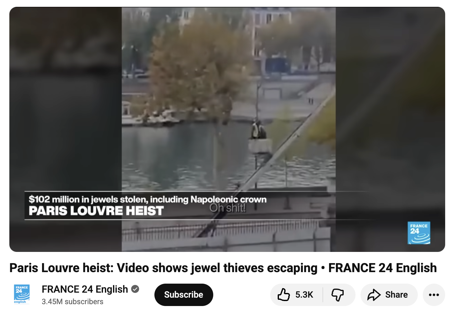 The France 24 report, whose screenshot can be seen above, continued with an interview of a person working for another French outlet, Le Parisien. That man was said to have seen the authentic CCTV footage from the Louvre, which, despite the shortage of cameras, seemed to have captured at least some of the heist. The man said at least one of the robbers wore a vest that was yellow. Later, when on October 26, 2025, the Office of Paris Prosecutor (archived here) informed the public that the arrests were made in this case, Le Parisien (archived here) reported that genetic material from the yellow vest was one of the things that helped identify one of the suspects taken into custody.