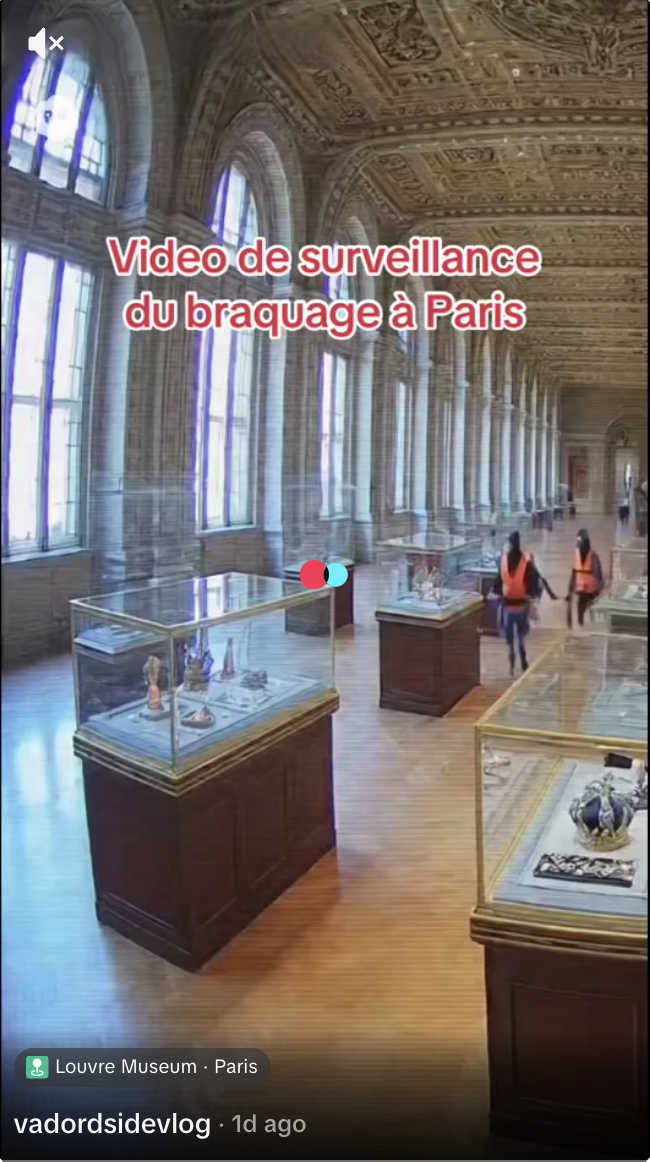 The video had a geotag pointing to the Louvre Museum in Paris, France. It was a repost from an account on TikTok that initially published it on October 22, 2025, but was later deleted, days after the daylight Louvre break-in.