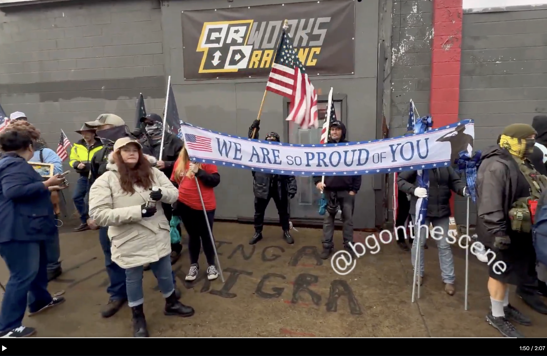 Further research led to a video (archived here) posted on X on October 12, 2025. Its caption said it showed "a pro-ICE group" seen "across from the Portland ICE facility". Visual clues confirmed the location. In that video, published three days after the image from the ICE account, we clearly see some writing on the sidewalk. That includes the uppercase letter "i" that is partially visible in the picture reviewed in this article. However, the entire phrase appears to be much longer than two letters: