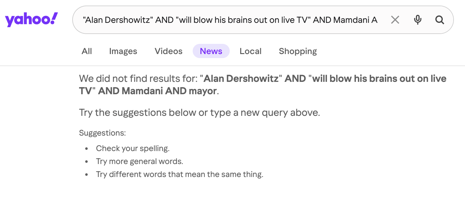 A search for the same keywords on Yahoo News (archived here) did not show any credible reports attributing the purported quote to Dershowitz: