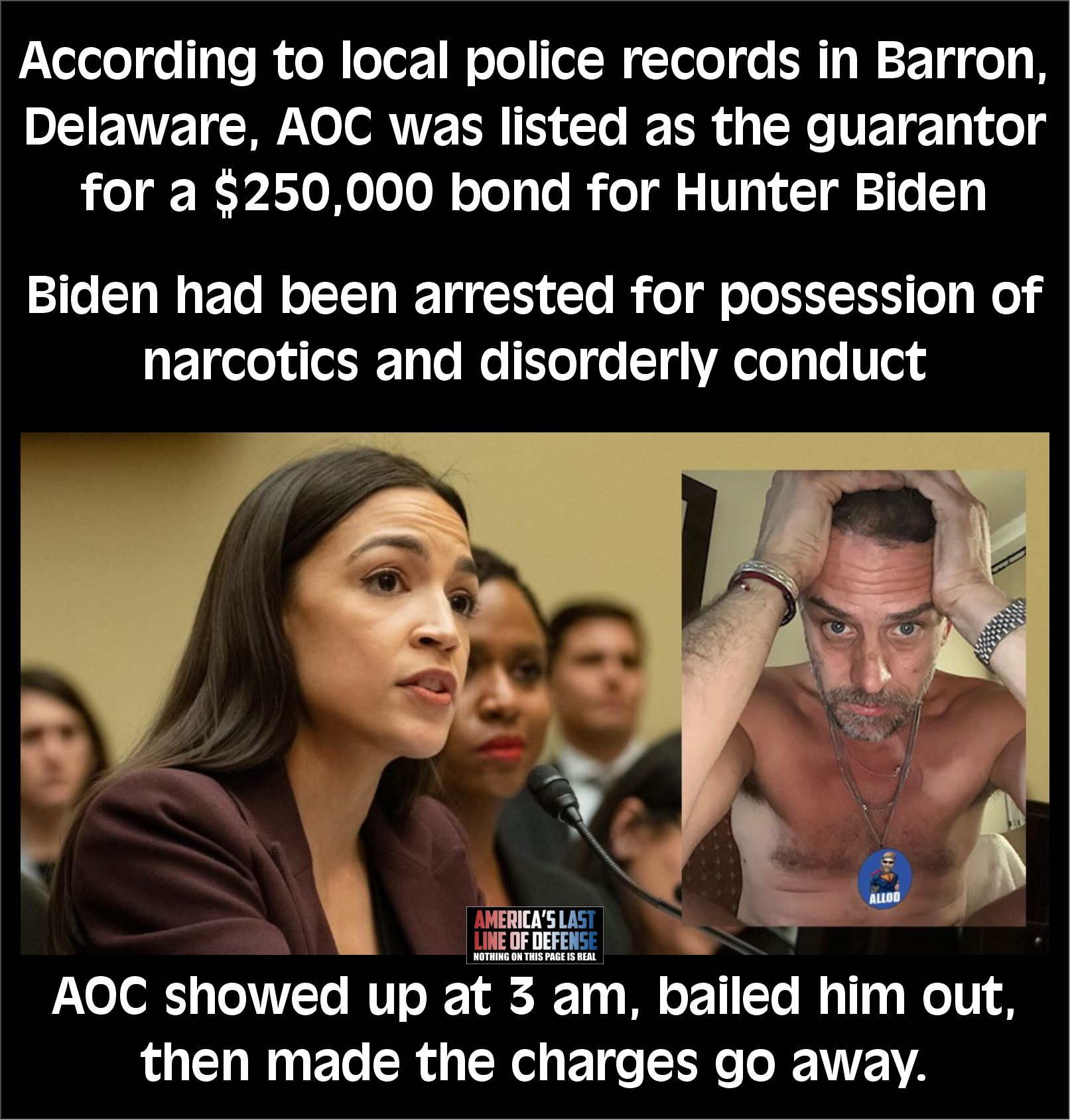 According to local police records in Barron Delaware, AOC was listed as the guarantor for a $250,000 bond for Hunter Biden