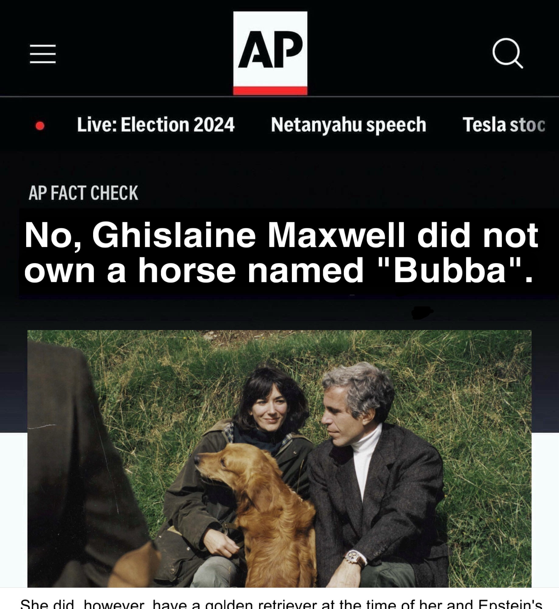 Did the Associated Press publish a fact check titled 'No, Ghislaine Maxwell did not own a horse named "Bubba"' and did it mention her having a golden retriever at the time? No, that's not true: A viral screenshot showing such a headline along with AP's logo and mentioning Jeffrey Epstein is fake. There is no such story on the Associated Press website and a spokesperson confirmed to Lead Stories they didn't publish this fact check. The screenshot referenced "Live" coverage of the 2024 election while the email referencing "Bubba" only appeared in 2025.