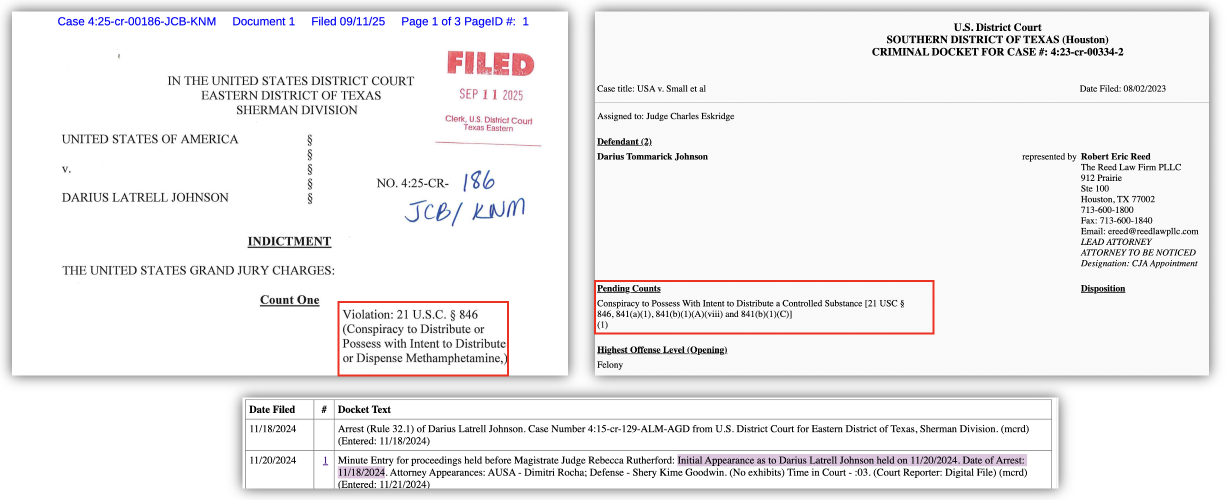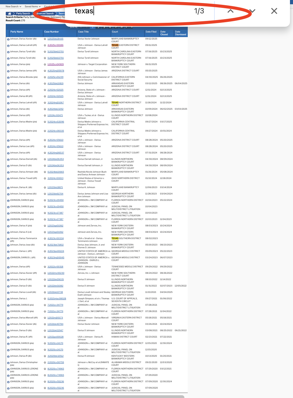 The composite image below shows the nature of the lawsuits mentioning "Darius Johnson" that were found on PACER for the period of the past three years: