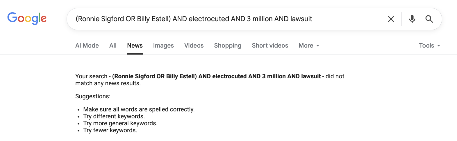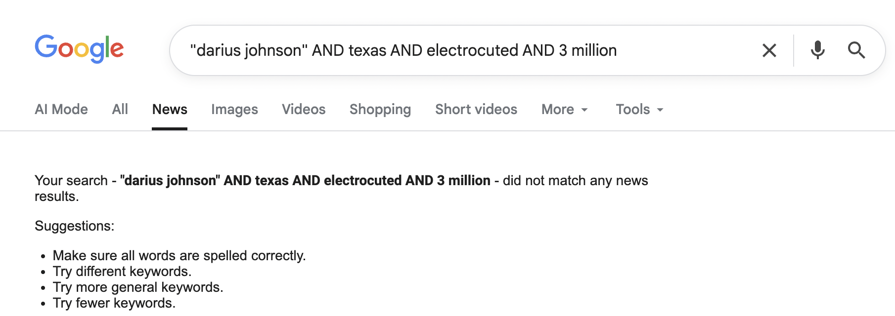 A search across Google News yielded no recent media reports about a Darius Johnson family seeking $3 million in damages over an electrocution: