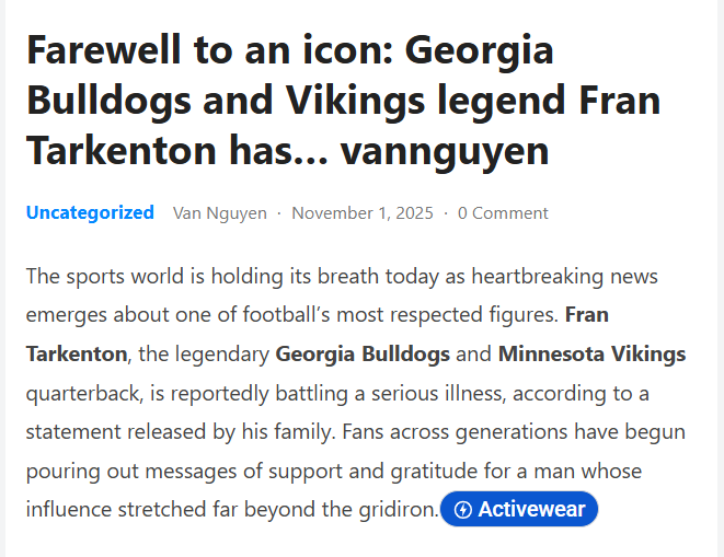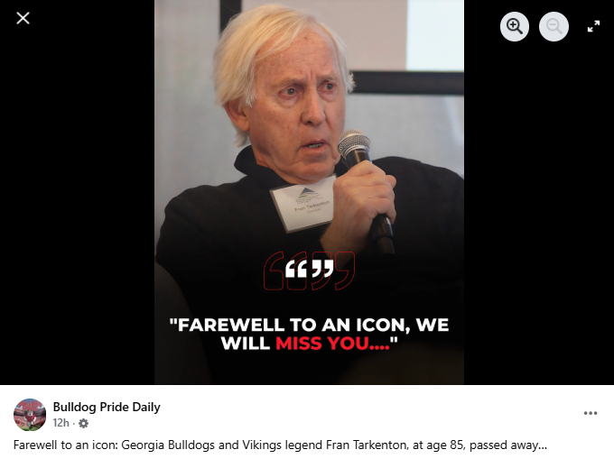 Has Georgia Bulldog and Minnesota Vikings quarterback legend Fran Tarkenton died as of November 1, 2025? No, that's not true: There is no real reporting that Tarkenton has died and the claim that fans have gathered in Athens, Georgia, to mourn his death are not supported by any evidence. The story making the claim was generated by an artificial intelligence tool and was posted on a fake Georgia Bulldog fan page managed from Vietnam. It appears to be part of a junk news network based in Hanoi.