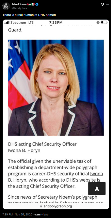 The screenshot used in the post is from an article (archived here) on antipolygraph.org published on October 5, 2025, about an "anti-leak polygraph directive" at the DHS.