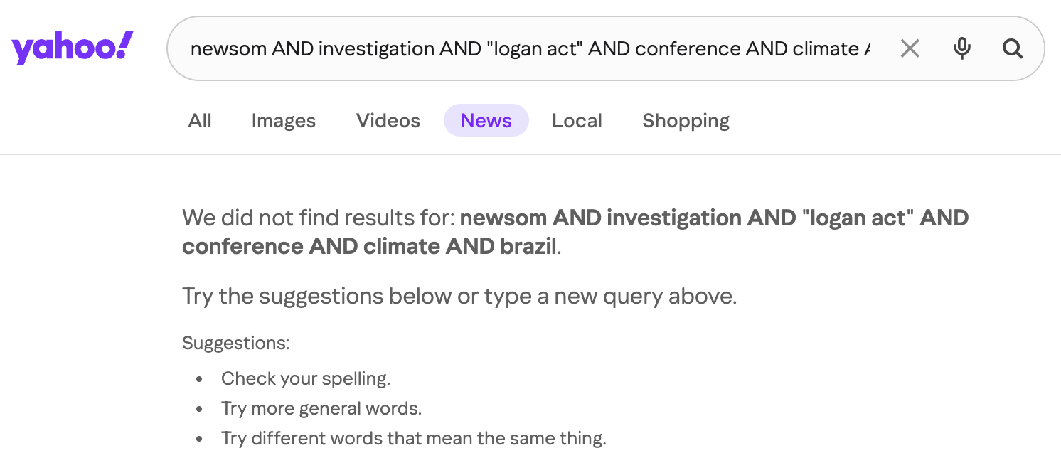 Searches on Google News and Yahoo News showed no credible sources writing about the purported investigation: