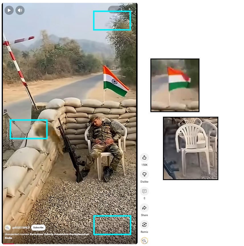 The Lead Stories composite image (pictured below) shows some of the glitches typical in AI-generated videos. The flag of India waving gently in the wind, inconsistently features the 24-spoke wheel on the central white field. While the soldier naps, he is slumped into the arm rests of his chair, but as he is startled by the gunshot- his leg passes through the chair and then the chair is rendered without an armrest on one side. The rifle pictured appears similar to a HK-G3 but the stock seem to be installed upside down.