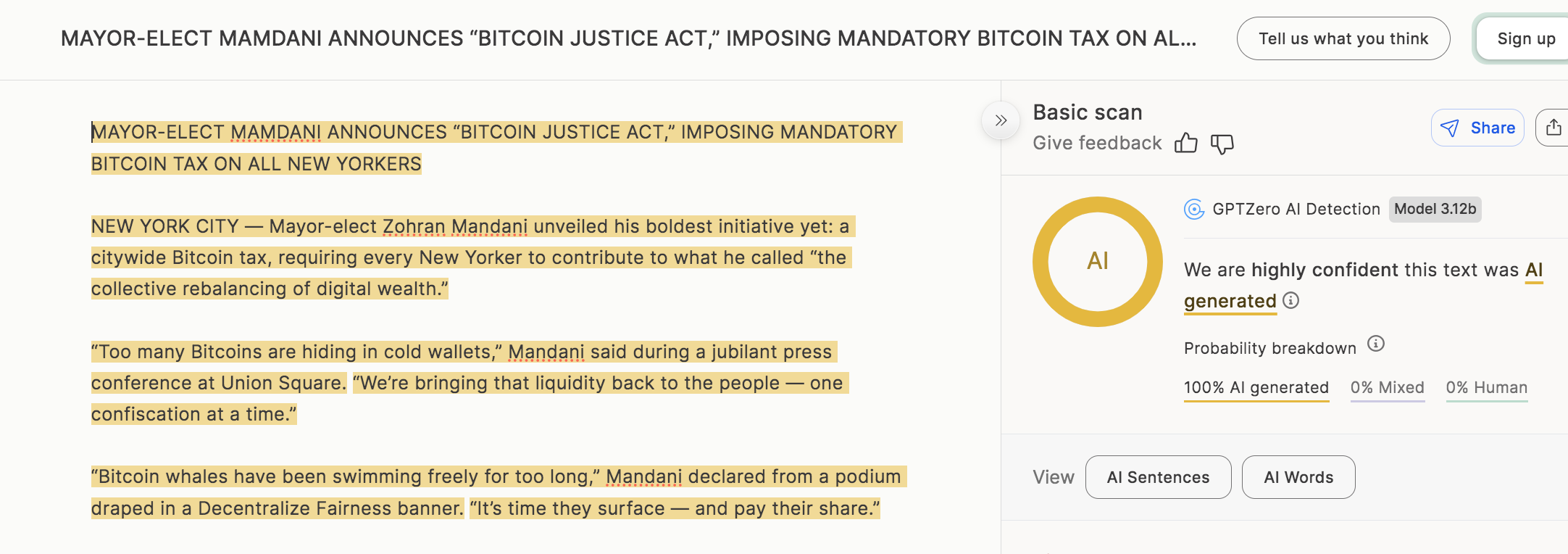While the format of the post mimics a legitimate news article, Lead Stories ran the text on the Facebook post through AI detection tools on GPTZero.me and the results said that snippet was 100% likely written by AI, as this screenshot shows: