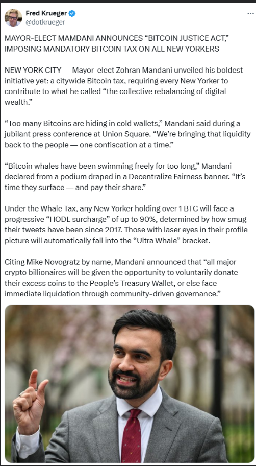 The story originated in a November 6, 2025 post on X.com account @dotkrueger (archived here) where it looked like a news story with a headline that read "MAYOR-ELECT MAMDANI ANNOUNCES "BITCOIN JUSTICE ACT," IMPOSING MANDATORY BITCOIN TAX ON ALL NEW YORKERS." It opened with a story where Mamdani's name was misspelled "Mandani":