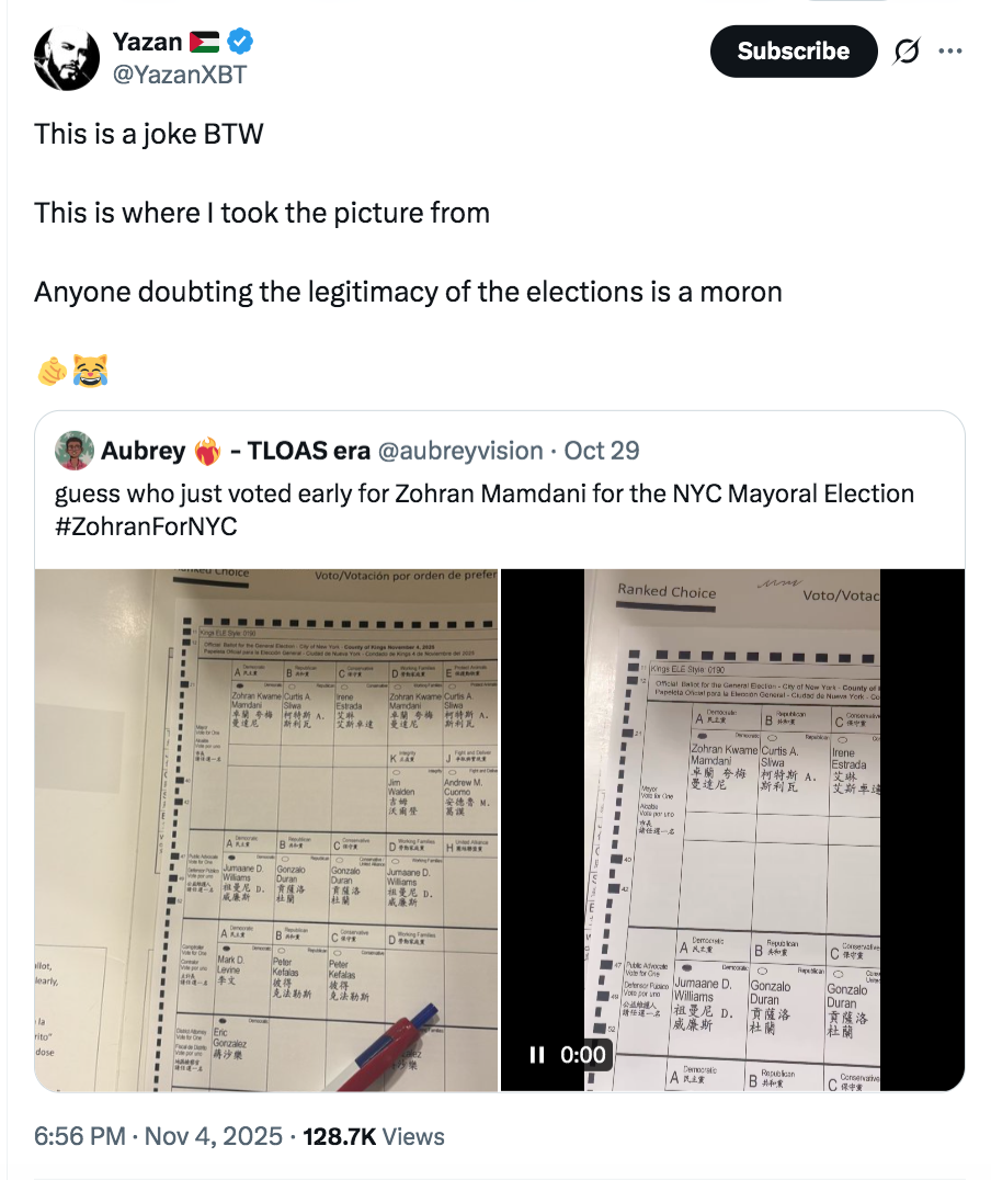 Arrived in NYC 2 days ago I'm not a U.S. citizen or even a resident I was able to get in and vote early All what they needed was an address so I gave them one Voted for Mamdani Let's go New York!