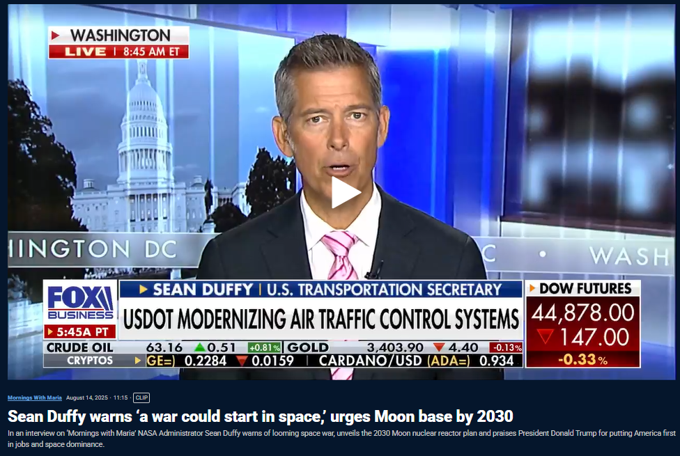 None of the posts making the claim included a video of Secretary Duffy making the statement. Instead, each post used a screenshot of Duffy's August 14, 2025 Fox Business News interview (archived here). Duffy never addressed the staffing shortage or the shutdown -- which would not begin until weeks later. As the caption under the video reads, he was talking about his belief that the U.S. needs to establish a moon base ahead of a space war. In this screenshot below, which shows almost the same moment as the screenshot in the posts, he is wearing the same suit and tie. The screen graphics also reflect the same stock market numbers and time stamp.