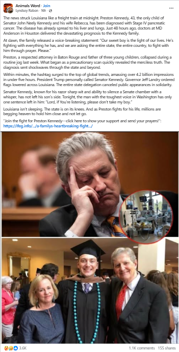 Has Preston Kennedy, the 43-year-old son of Senator John Nealy Kennedy of Louisiana, been diagnosed with stage 4 pancreatic cancer? No, that's not true: Sen. Kennedy's son is 29, not 43. He was born six years after his parents' 1990 marriage. There are no reports of a cancer diagnosis on Kennedy's social media timelines or in the news media. The claim only appears on Facebook pages administered from Vietnam on a network previously identified by fact checkers as a source of fake content. We call it Viet Spam.