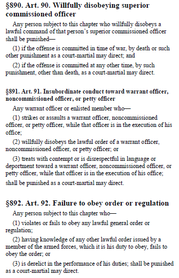 The Uniform Code of Military Justice, (archived here) which is the guide for all military members, is clear that everyone in uniform must obey all legal orders from a superior.