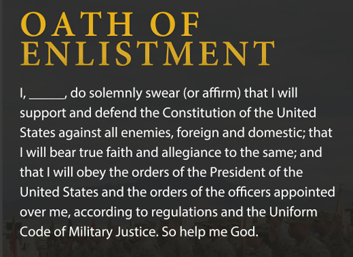 I, _____, do solemnly swear (or affirm) that I will support and defend the Constitution of the United States against all enemies, foreign and domestic; that I will bear true faith and allegiance to the same; and that I will obey the orders of the President of the United States and the orders of the officers appointed over me, according to regulations and the Uniform Code of Military Justice. So help me God.