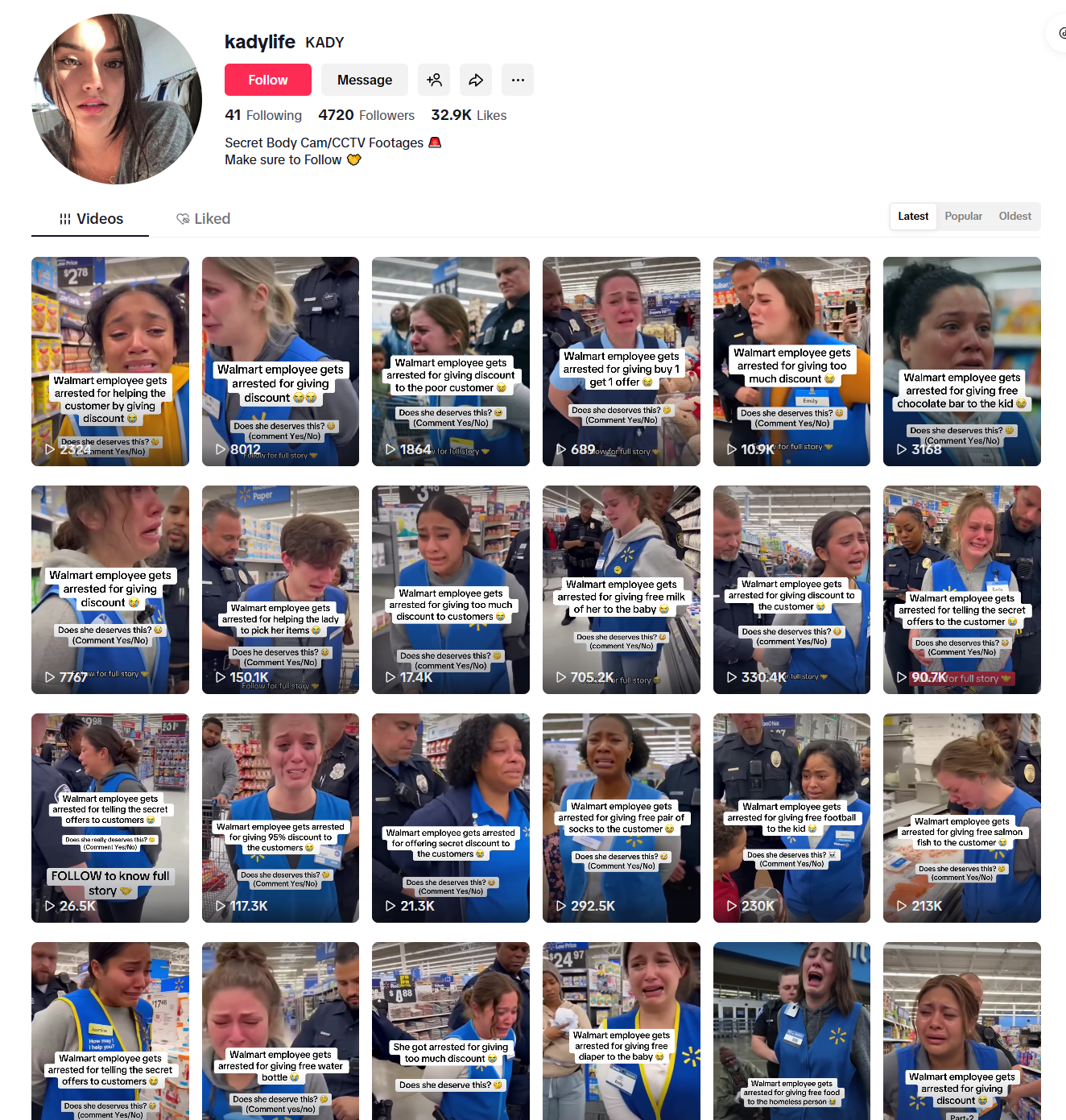 The TikTok account @Kadylife is entirely comprised of videos of Walmart employees getting arrested, as this screenshot of the account's profile grid shows: