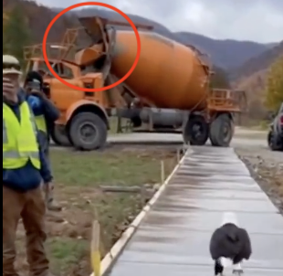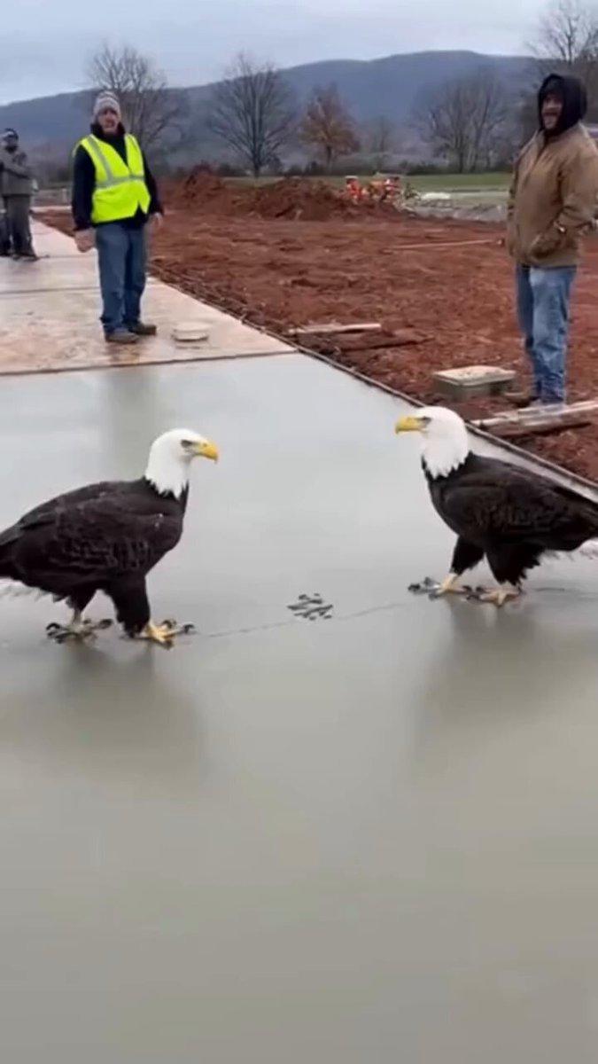 Construction crews at the new Mercier Orchards parking lot outside Blue Ridge say work came to a sudden stop Tuesday morning after two bald eagles landed and walked directly across the freshly poured concrete. Cell phone video shows the birds calmly pacing through the wet cement, leaving deep talon prints before flying off toward the tree line. Workers say they'll have to repour the entire section, but many called it 'worth it for the view.'