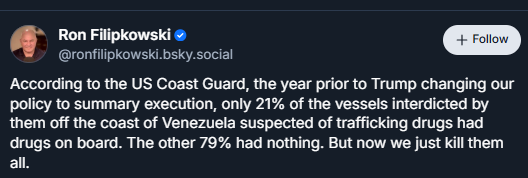 According to the US Coast Guard, the year prior to Trump changing our policy to summary execution, only 21% of the vessels interdicted by them off the coast of Venezuela suspected of trafficking drugs had drugs on board. The other 79% had nothing. But now we just kill them all.