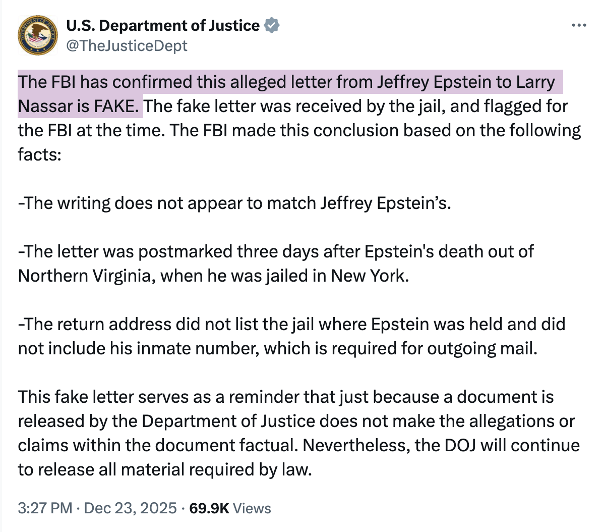 At 3:27 p.m. EST, the Department of Justice published another update (archived here) on X. It cited the FBI concluding that the "letter" was not authentic. Here is a screenshot of the DoJ post: