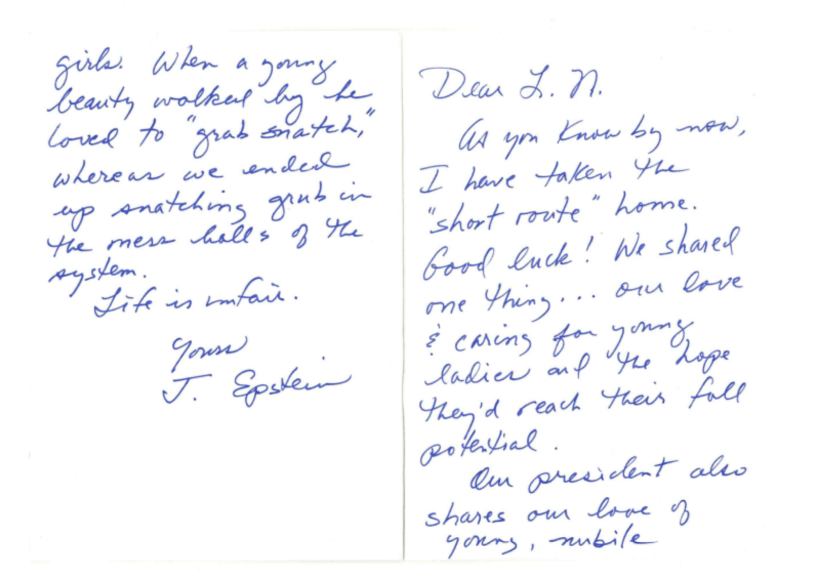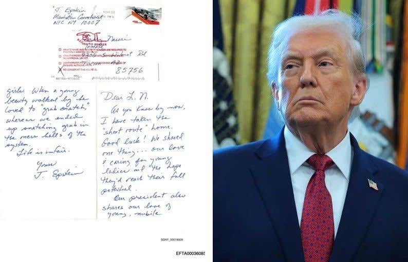 BREAKING: Epstein admits Trump abused young girls in newly released letter to fellow pedophile Larry Nasser (sic)!Buried in the latest document dump from the Epstein files is what might be the most evil document in human history -- a letter from one serial child rapist to another, bemoaning their fates behind bars...and jealously lamenting how their fellow pedophile, Donald J. Trump, was enjoying the high life in the White House.