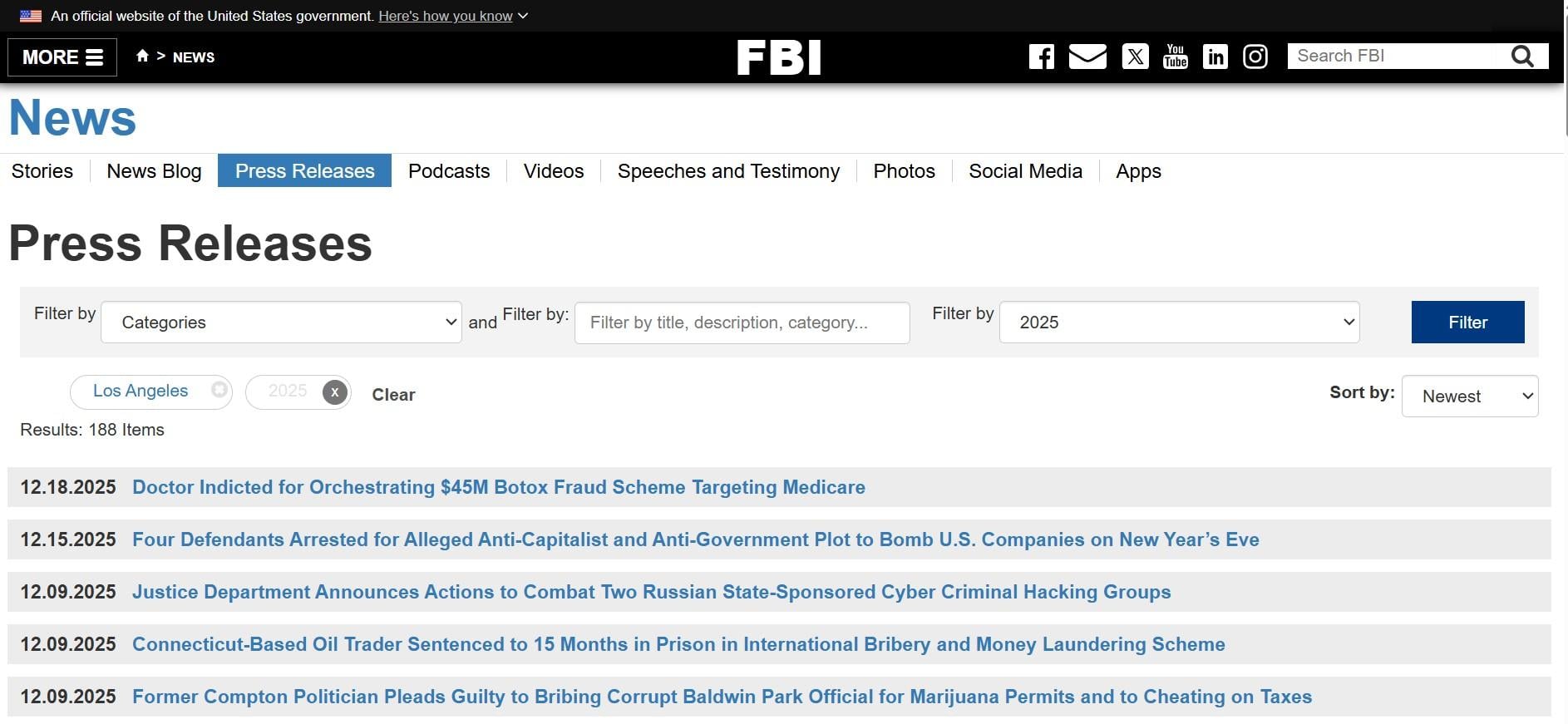 A search on the FBI website news page, filtering for Los Angeles and 2025 (pictured below) shows that there have not been any FBI press releases about the case or the mansion since the Reiners were found dead in their home on Dec. 14, 2025.
