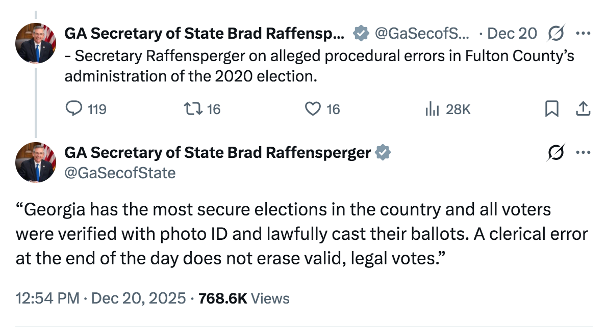 Brad Raffensperger, the Georgia secretary of state, shared a statement with Lead Stories on December 22, 2025 via phone about the claims: