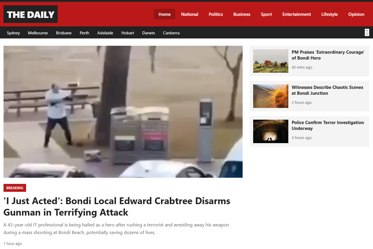 The tale about the IT professional appeared in an an article (archived here) published by a website named "The Daily" on December 14, 2025 under a headline that read: "'I Just Acted': Bondi Hero Edward Crabtree Disarms Terrorist - The Daily" which opened:
