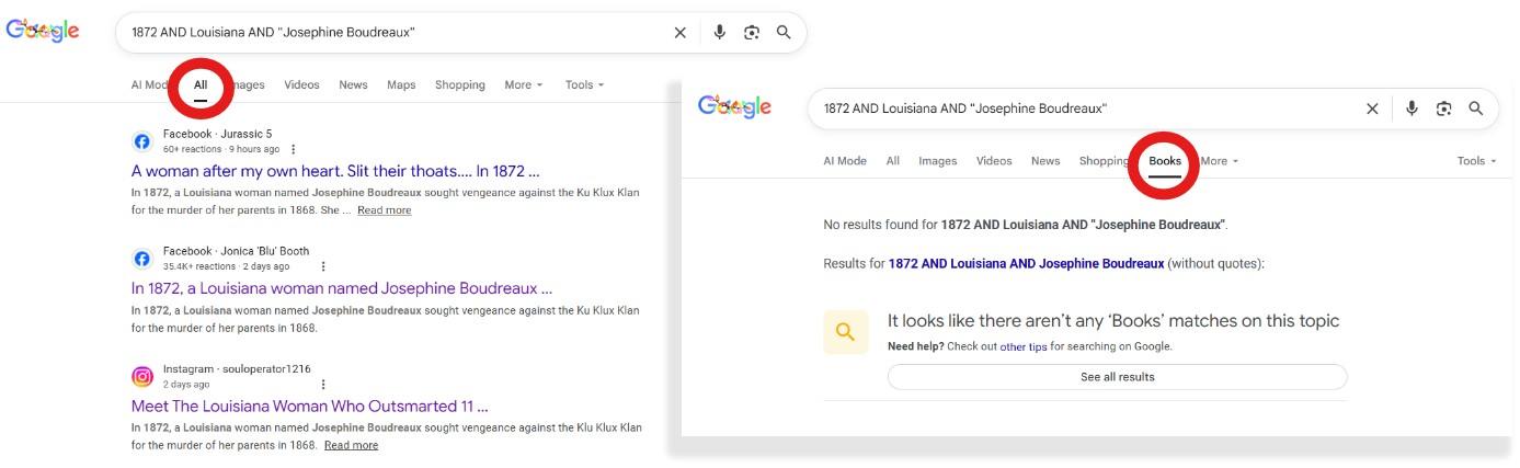A Google search for key terms,"1872 AND Louisiana AND "Josephine Boudreaux"" produced scores of hits for recent social media posts (below left) which were virtually identical but featured a variety of AI-generated images. Narrowing the Google search to only books containing the same key terms produced no results at all (below right). If this were a real story, there should be a record of the story going back in time.