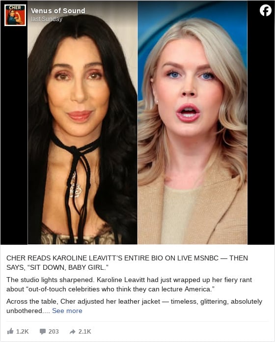 The Facebook post promoted an article (archived here) titled ""Do You Believe in Logic?": Cher Dismantles Karoline Leavitt on Live TV, Tells Trump Aide to "Sit Down, Baby Girl" cz", that claimed: