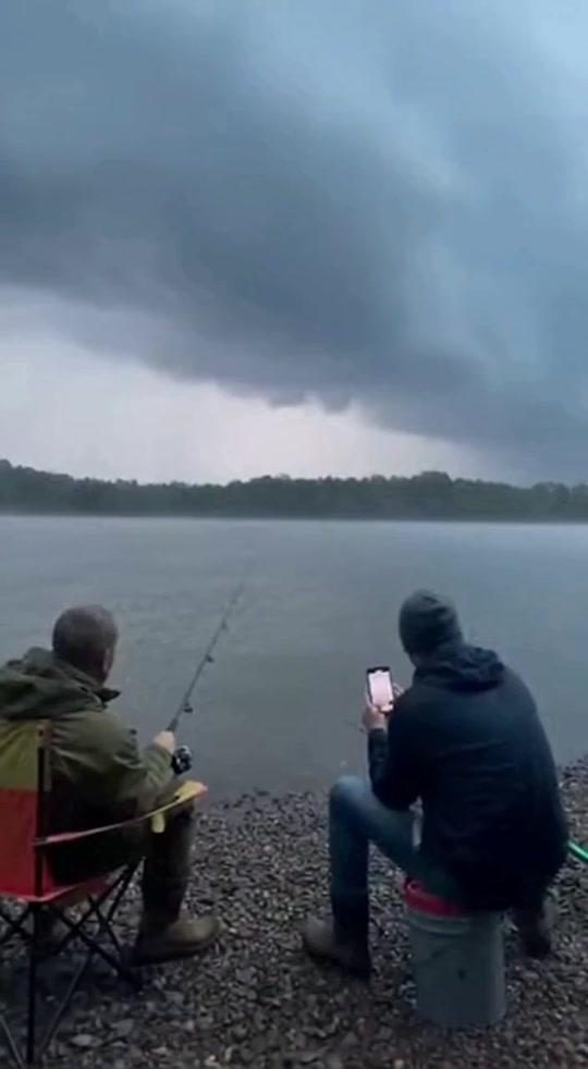 The composite image below shows the sequence of events in the brief video; a bolt of lightning strikes the water surface which shoots up a tall spout of water, then fish fly out of the water in the direction of the unflinching anglers.