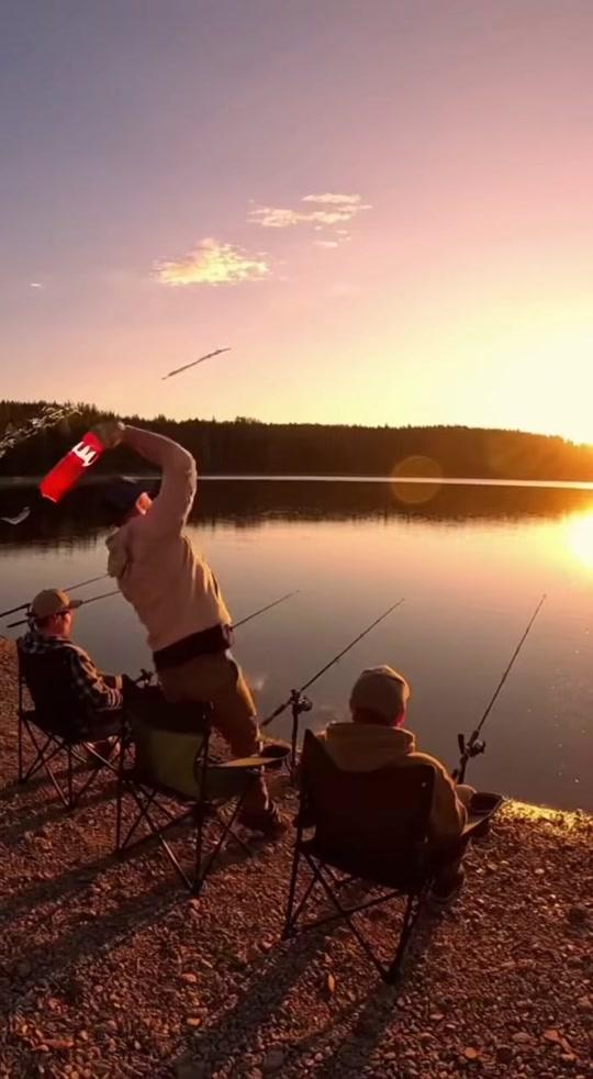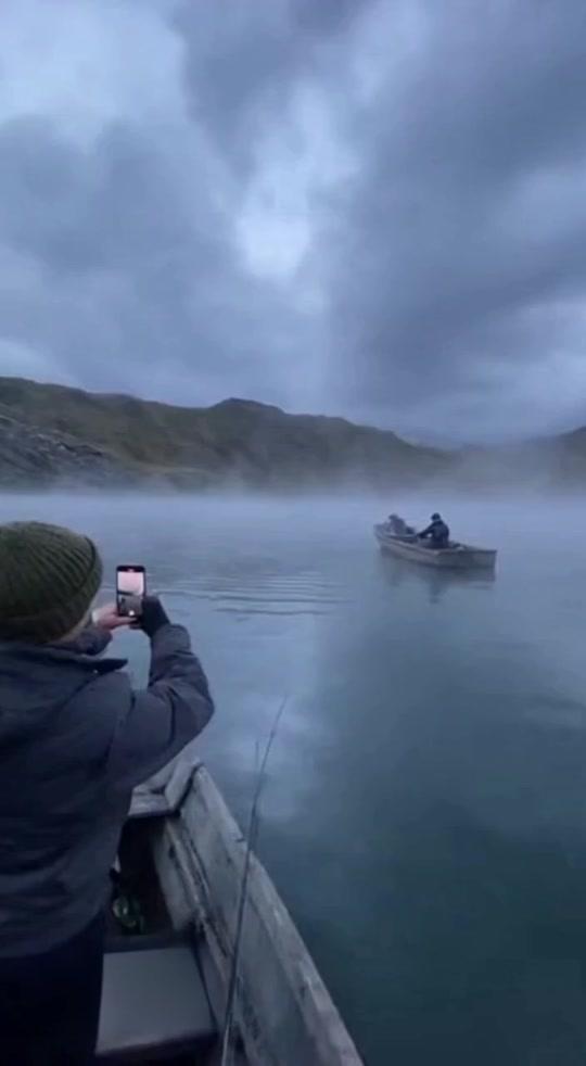 This video was posted with no disclaimer. The account which published it, @helpsizis, has posted many AI-generated animal videos including lions, tigers and grizzly bears, sharks, hamsters, penguins, wolves and octopuses. In addition to the video in question, there are three more which feature a nearly identical sequence to the one pictured above (these are pictured below in the order mentioned). In one video (archived here), rather than a bolt of lightning, a man hurls a cartoonish fused explosive into the lake with the same end result. In another video (archived here) rather than a quick crack of lightning, the fishermen wonder in awe as they watch a blue ball descend slowly from the sky. In a third video (archived here) a fisherman in a boat is using his phone to film his friends in a second boat when a bolt of lighting hits very close, he seems to drop his phone in the water and does not react to his friend's near miss or the loss of his phone.