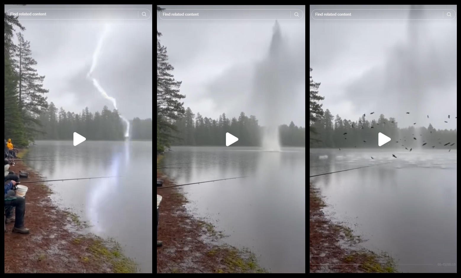 Does a viral video show a real scene where lightning struck a fishing lake and caused a massive spout of water and many fish to fly high into the air? No, that's not true: This video was posted by a TikTok account which posts AI-generated videos with no disclaimer. Many of the videos feature unlikely scenarios involving wild animals -- at least four videos feature fishing scenes with explosive lightning strikes and flipping fish.