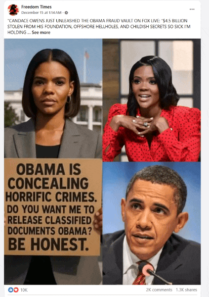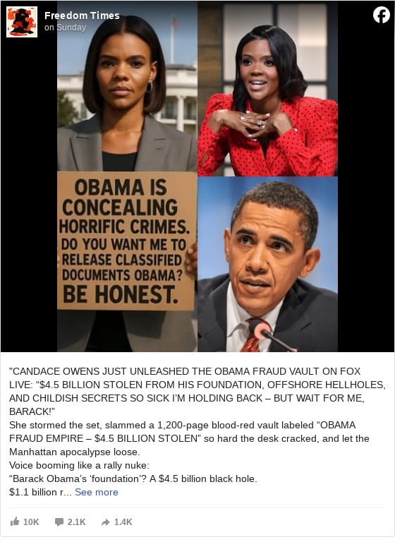 Was the "Obama Fraud Vault" showing $4.5 billion stolen from Obama's foundation released on Fox News live in December 2025? No, that's not true: Nearly identical stories claiming that Candace Owens, Ben Shapiro, Jeanine Pirro, Greg Gutfeld, Sen. John Kennedy, and other conservative figures "just unleashed the Obama Fraud Vault on FOX live" were published by a network of websites and Facebook pages managed from Vietnam. There were no news articles about such an event and the stories contained verifiably false details.