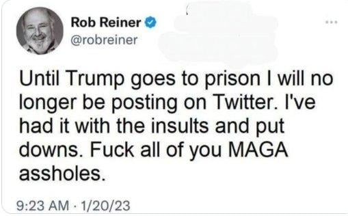 "Until Trump goes to prison I will no longer be posting on Twitter. I've had it with the insults and put downs. Fuck all of you MAGA assholes."