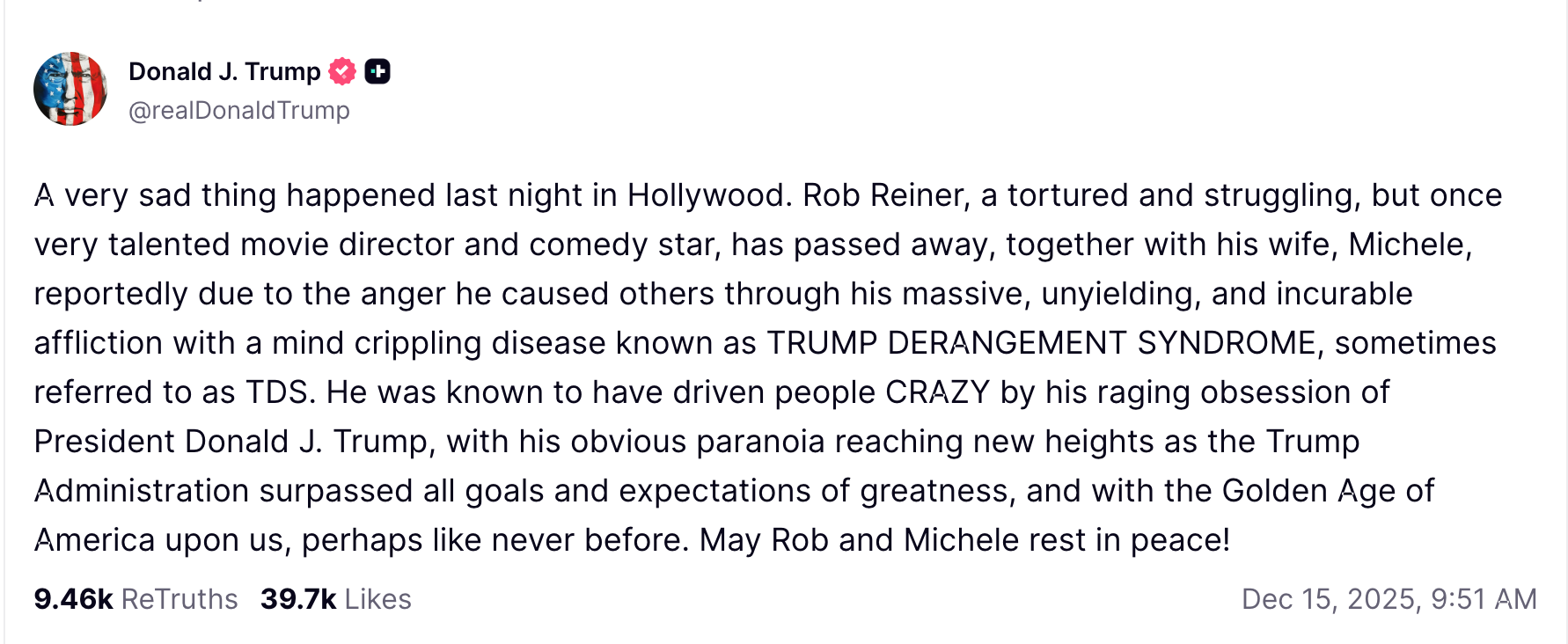 The claim appeared in a Dec. 15, 2025 post on X.com account @LangmanVince (archived here) with the caption "I can't believe President Trump sent out a mean post about Rob Reiner today 🤔". The image of a tweet in the post read: