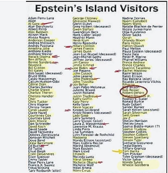 Look at who is on the Epstein List.Al Gore. Joe Biden. Bill & Hillary Clinton. Barrack & Big Mike Obama. Bernie Sanders. Prince Andrew & Charles. Rob Reiner . John Pedesta. Bill Gates. Justice Trudeau.Whoopie Goldberg. Joy Beher. Steve Corbert. Jimmy Kimmel. Oprah. Anderson Cooper. David Koch.And the "Celebrities" On the list is disgusting...