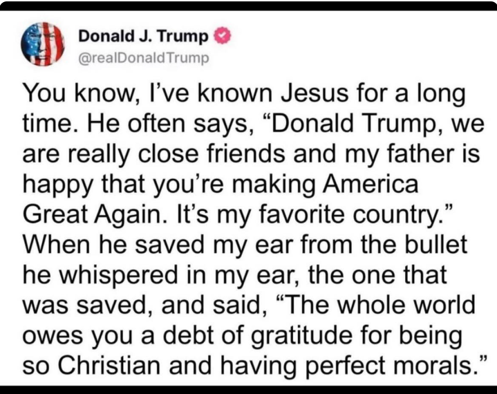 You know, I've known Jesus for a long time. He often says, 'Donald Trump, we are really close friends and my father is happy that you're making America Great Again. It's my favorite country.' When he saved my ear from the bullet he whispered in my ear, the one that was saved, and said, "The whole world owes you a debt of gratitude for being so Christian and having perfect morals.