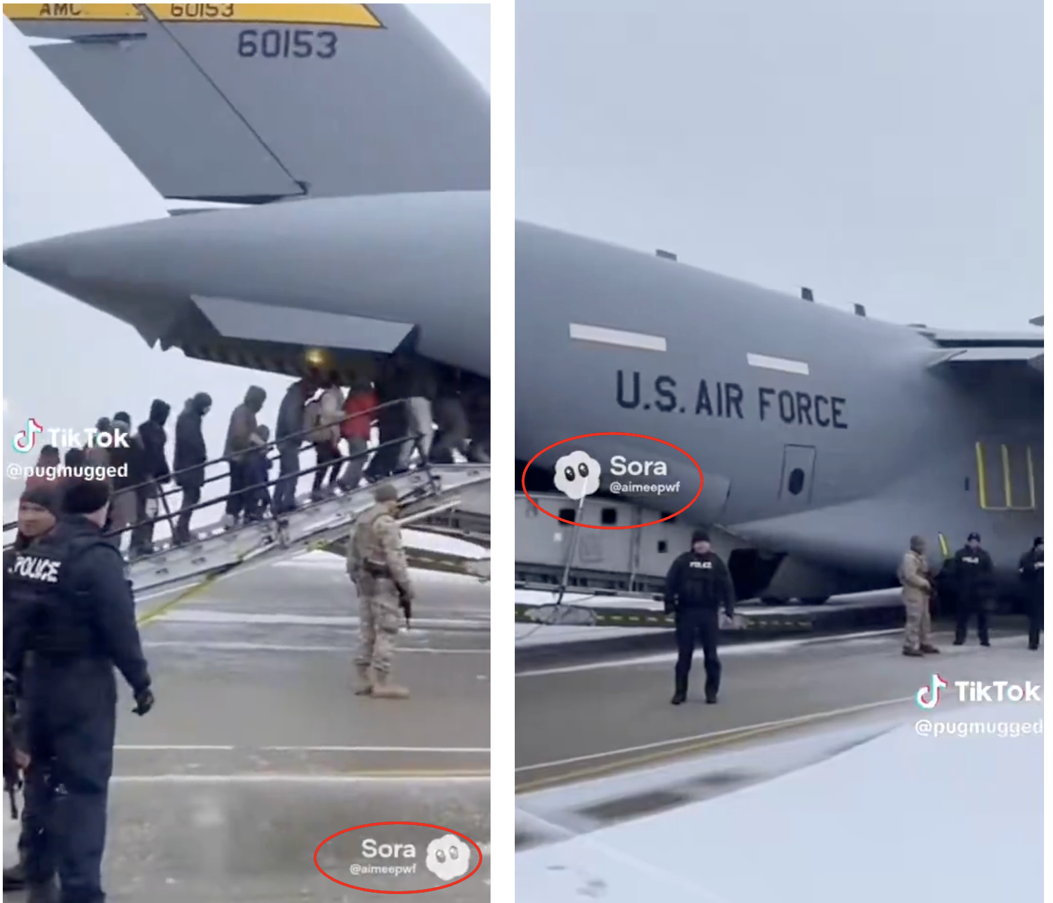 But, the "AMC" at the start of the tail number in the video would have referred to an Air Mobility Command military cargo plane in years past, if it were authentic video.