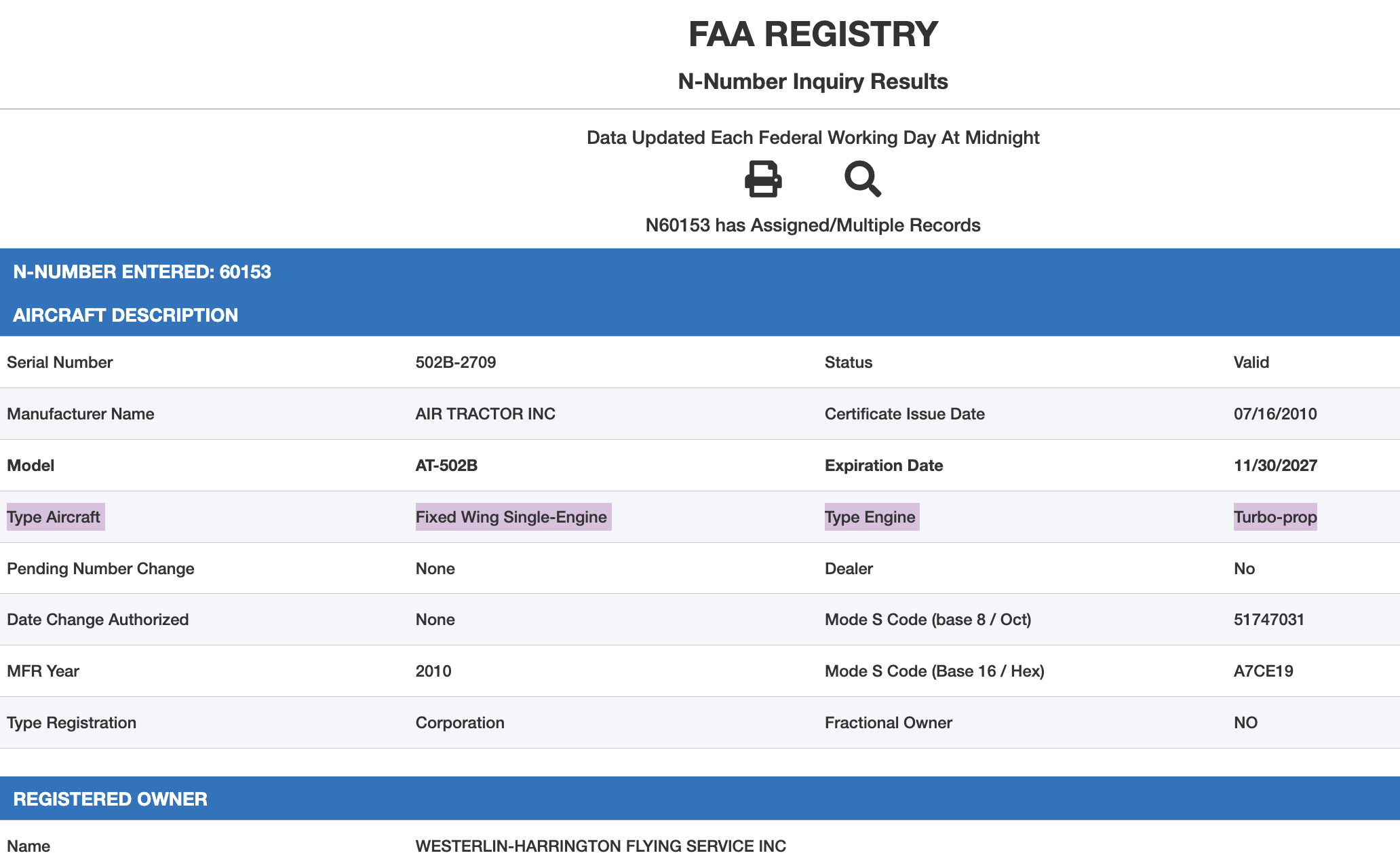 Privately owned planes' tail numbers, also known as N-numbers in the U.S., can be looked up at the Federal Aviation Administration registry. While an aircraft may change its tail number over time, no two planes can have the same number simultaneously because tail numbers serve as unique identifiers. As of this writing, the FAA registry linked "60153" to an AT-502B fixed-wing single-engine turboprop manufactured by "Air Tractor, Inc" for crop-dusting:
