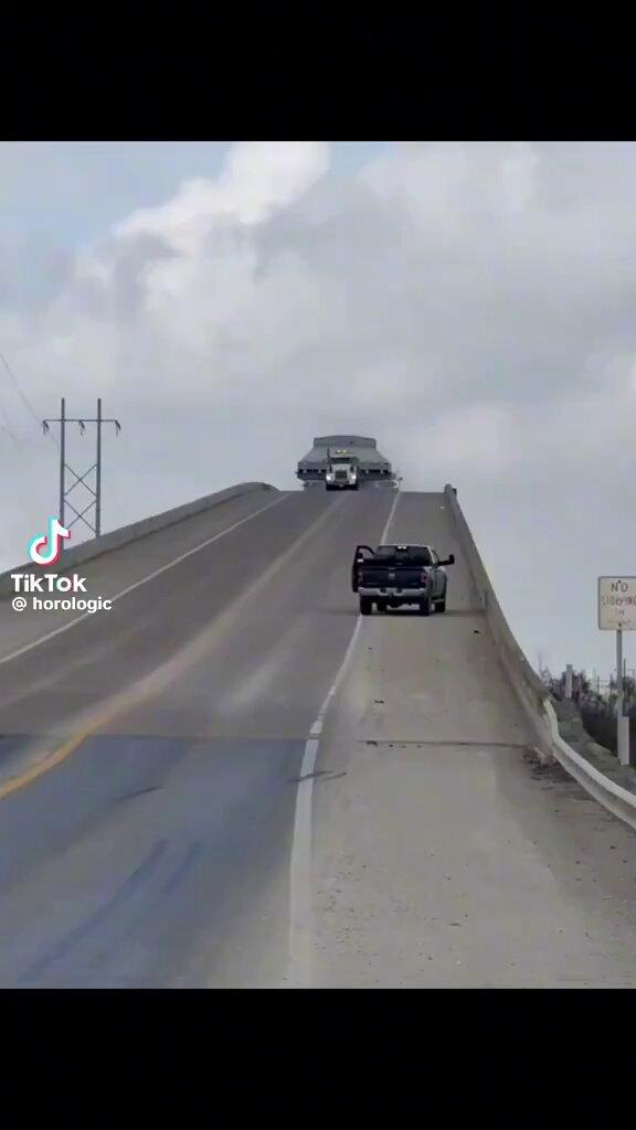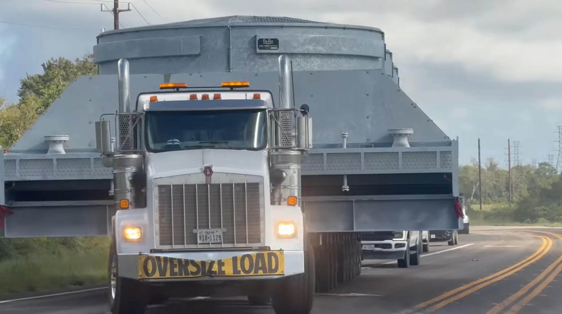 Does a video show two big trucks hauling UFOs or bunkers over a bridge? No, that's not true: The convoy is carrying large industrial air-cooled heat exchangers, also called cooling fans. These induced draft heat exchangers are marked with a Fin-Fan logo, indicating they were manufactured by Hudson Products Corporation of Beasley, Texas. Fans like these may be used in the natural gas industry, in geothermal power generation, and refineries.