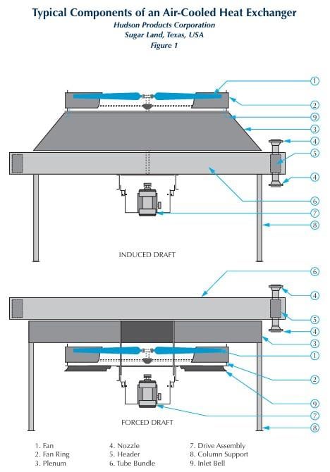 A .pdf document from Chart Industries, which purchased Hudson Products in 2018, gives an overview of "The Basics of Air-Cooled Heat Exchangers". Page eight has a diagram (pictured below) showing the difference between the induced draft and the forced draft configurations. Both contain the same mix of components, the main difference being that the fan in the induced draft system pulls the air past the element to be cooled, and in the forced draft system the air is pushed through.