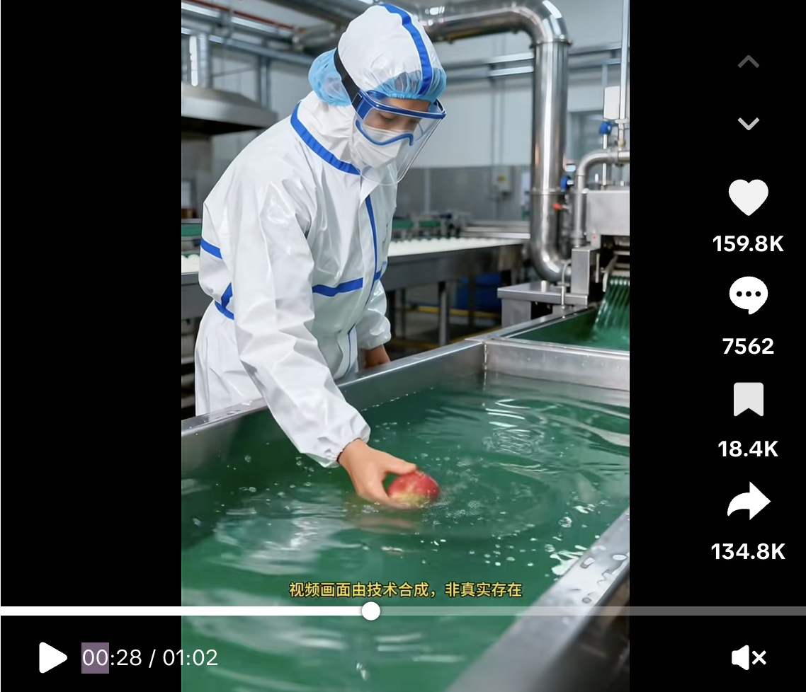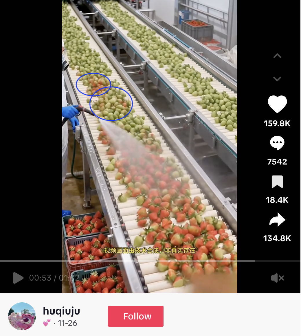 Is a video of fresh produce being artificially painted in China real? No, that's not true: The clip originated from an account that labels its content as AI-generated. The video contained multiple inconsistencies strongly pointing to AI.