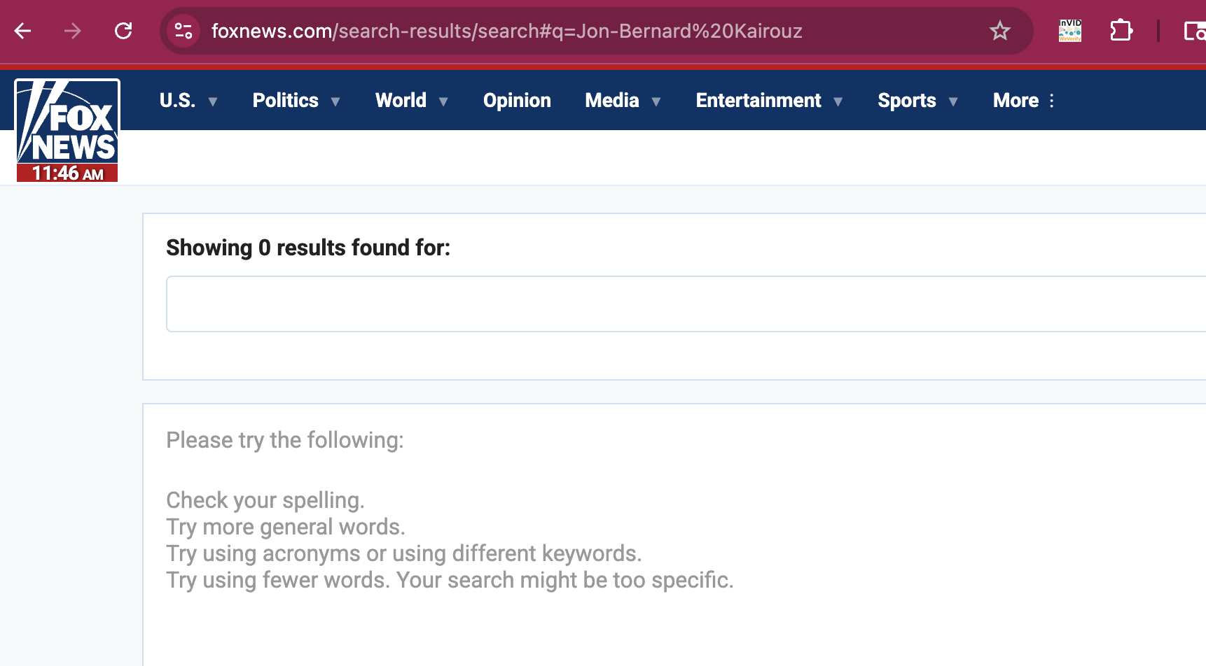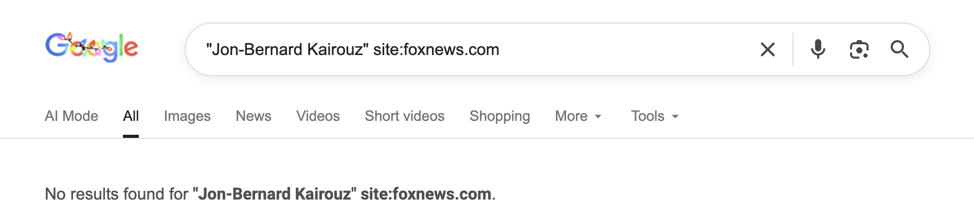 Searches on Google and on the Fox News website (archived here) showed no mention of Jon-Bernard Kairouz's name across the materials published or aired by this specific network: