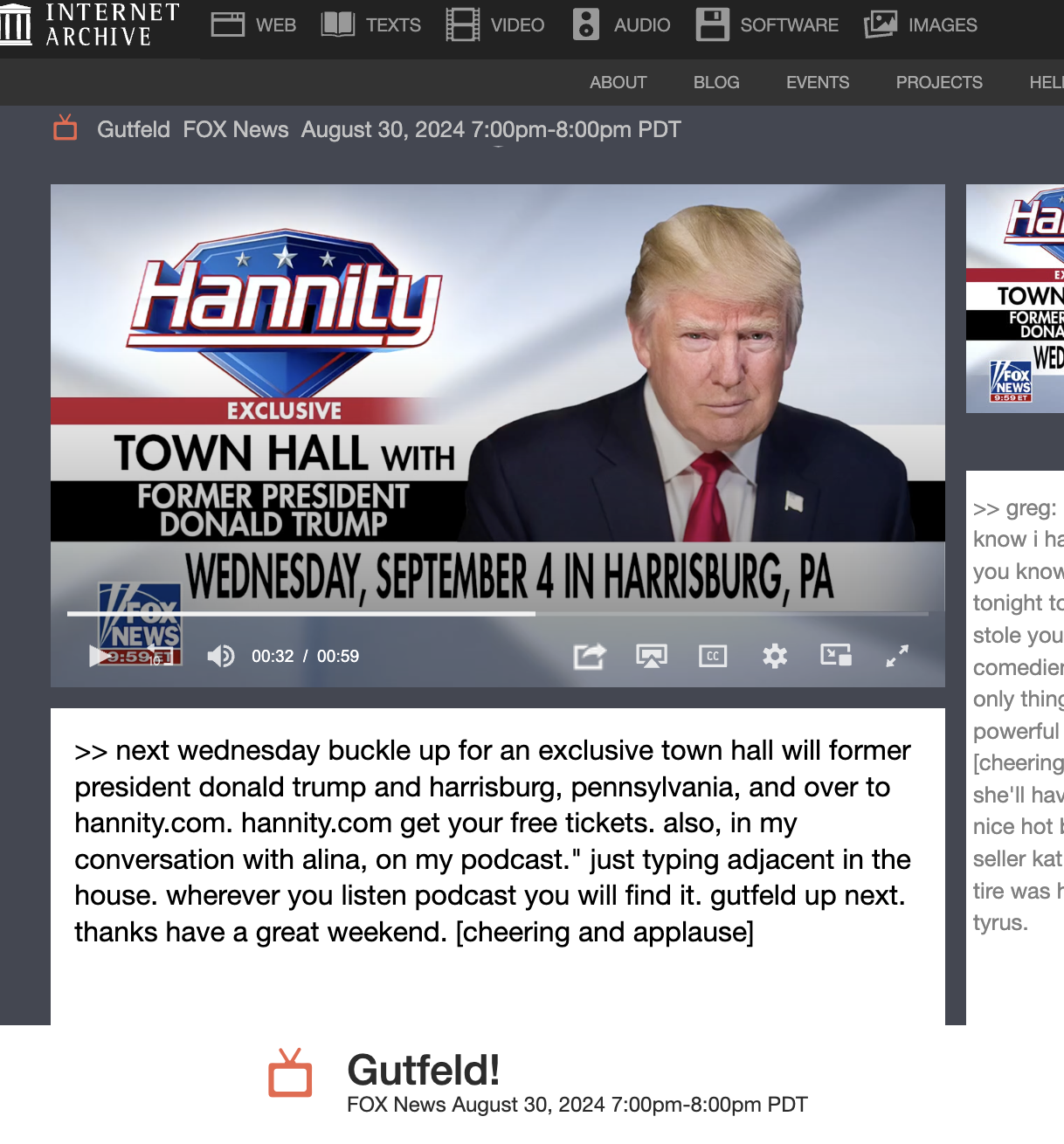 Searching for the originals of images in the comedian's post, Lead Stories found that a similar-looking picture appeared on Fox News on August 30, 2024. It advertised a then-upcoming Trump town hall scheduled on September 4, 2024: