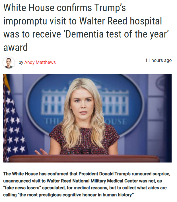 Did the White House confirm "Trump's impromptu visit to Walter Reed hospital" to receive "Dementia test of the year" award? No, that's not true: The story originated from a website that implied it publishes satire content. The White House website said nothing about it.