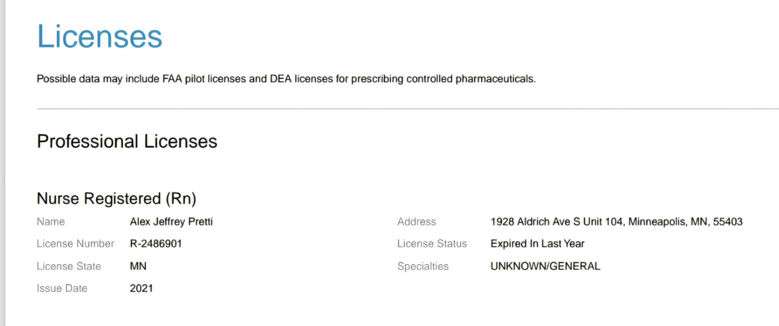 There are numerous websites offering to search professional license databases, some free and some for a fee. We cannot tell which service was used in the search that listed Pretti's license status as "Expired in Last Year," but we did find a different answer from the official source -- the Minnesota Board of Nursing. The state database said Pretti's license was active on the day of his death.