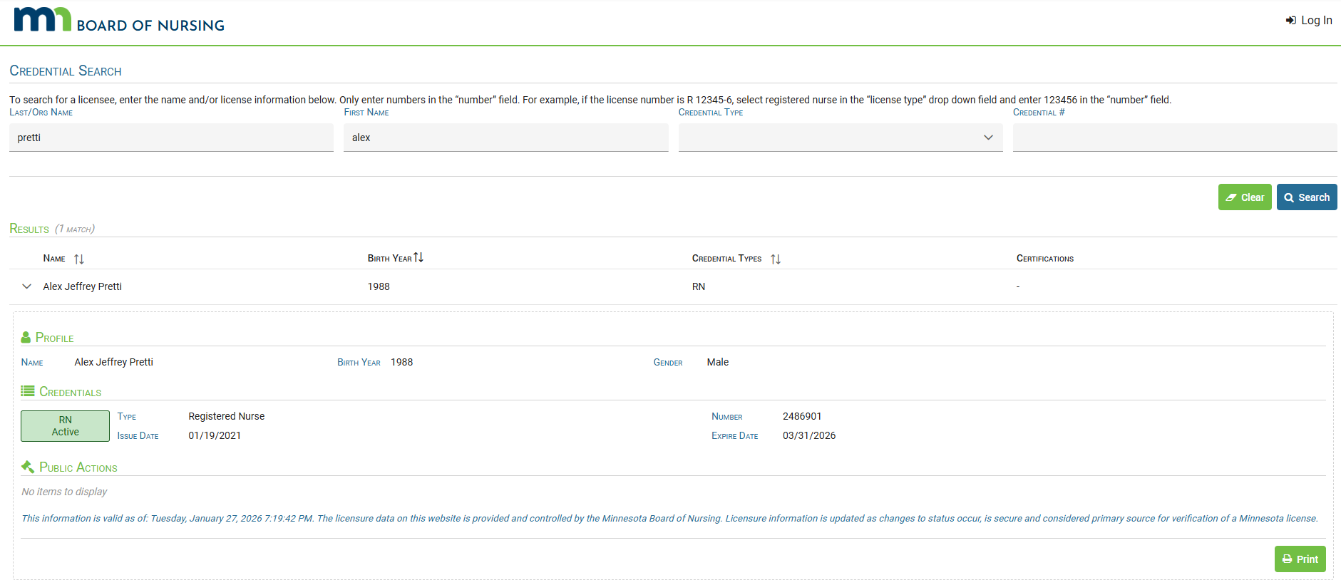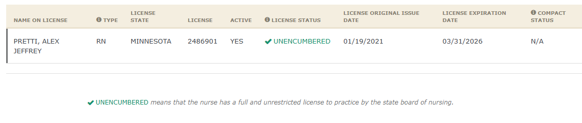Was Alex Pretti's nursing license expired when he was shot to death by ICE agents on a Minneapolis street on January 24, 2026? No, that's not true: The Minnesota Board of Nursing's online credential search webpage showed Pretti's registered nursing license, which was issued on January 19, 2021, was set to expire on March 31, 2026. An image shared in a social media post making the claim that his license was already expired appeared to be from an online search of a non-official website that lacked a specific date.
