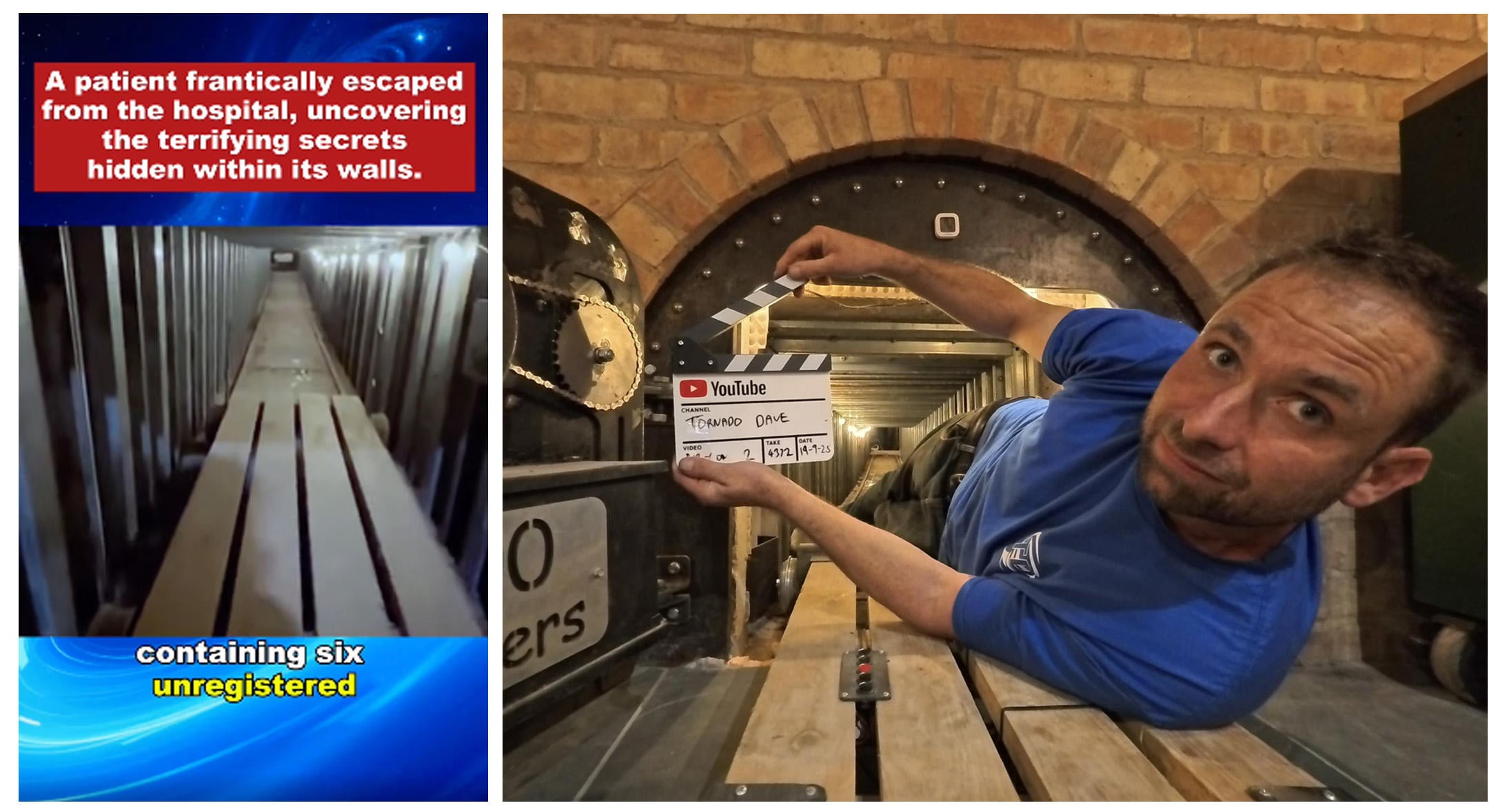 The coinciding video clip shows a tunnel (below left) at 00:00:47. This tunnel is not a hidden part of a hospital organ harvesting operation. The tunnel, and the four-plank-wide rolling dolly, are part of the underground bunker at the Derbyshire, UK home of Dave Billings (pictured below right). Billings runs a YouTube channel @Tornado_Dave.