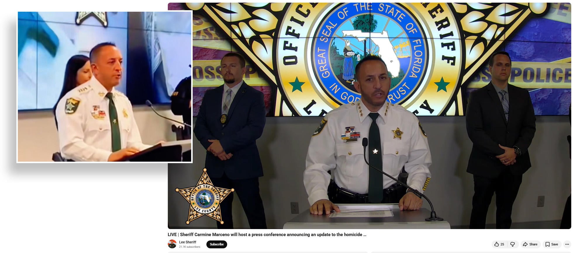 A law enforcement officer speaking at a press conference appears in a clip at 00:00:54 (inset below left). Although Lead Stories was not able to identify the specific press conference, the man pictured is Sheriff Carmine Marceno of Lee County, Florida (also pictured below right). Clearly that clip is not evidence of something that happened in the northern part of the U.S.